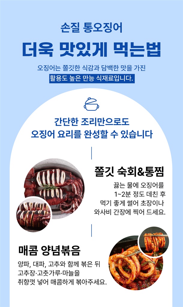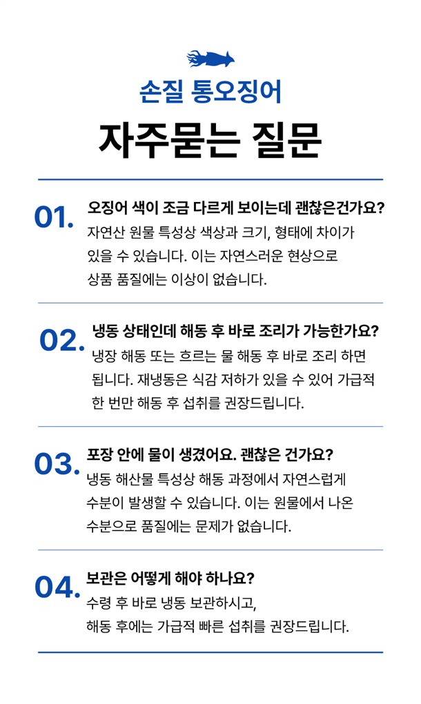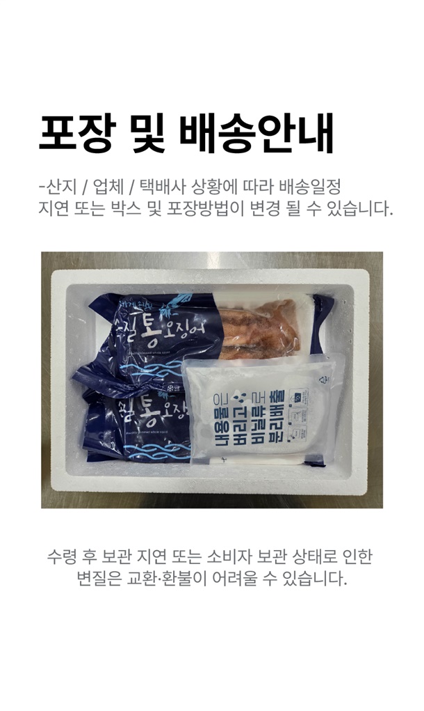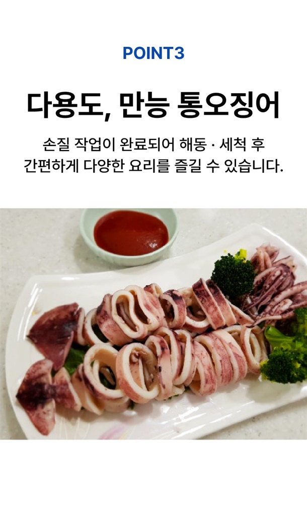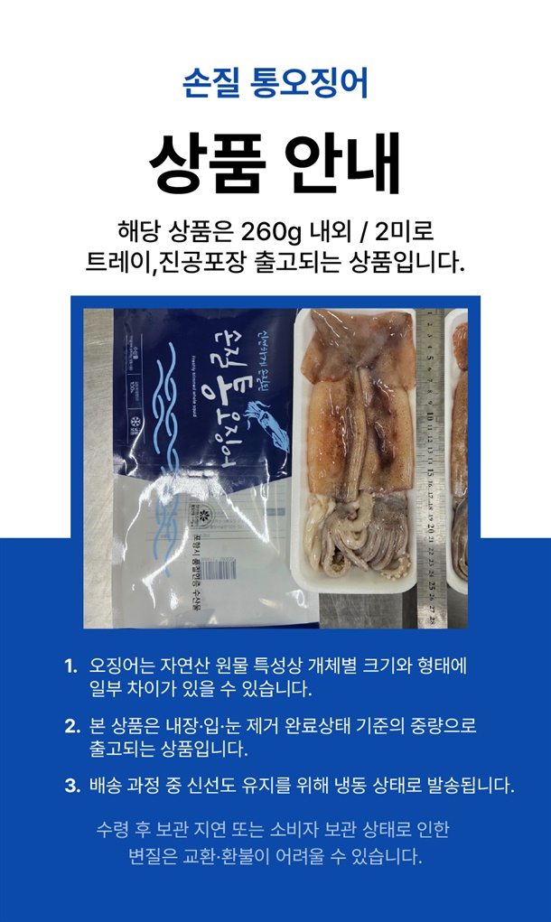 | 소비자 안전을 위한 주의사항 | 1.해동 후 재냉동 금지 / 2.충분히 가열 후 섭취 권장 / 3. 오징어 100%(원양산) |