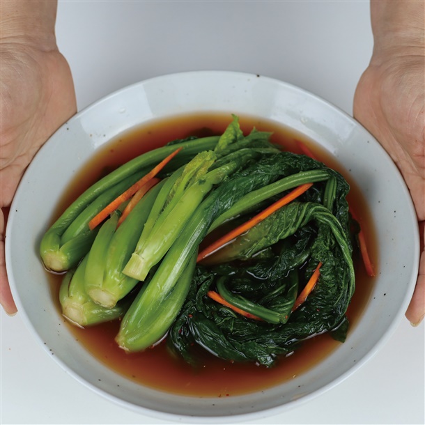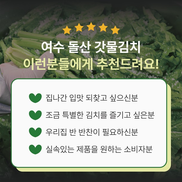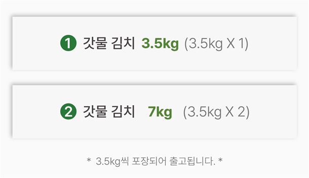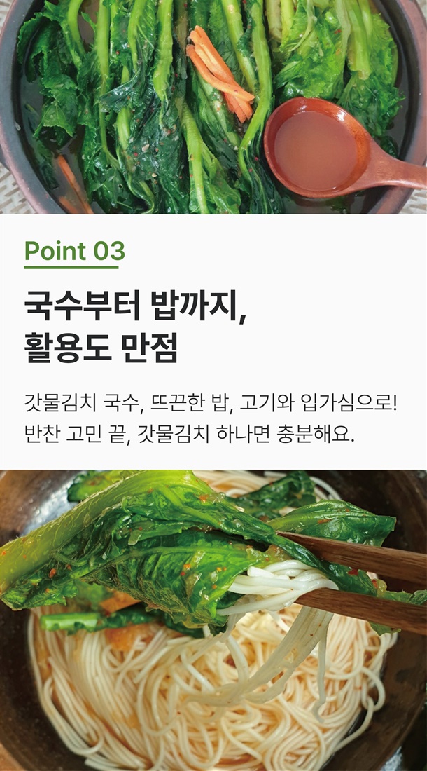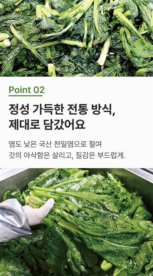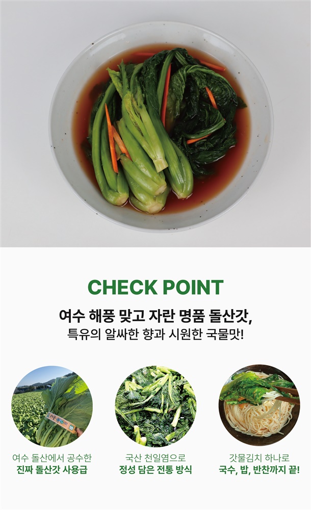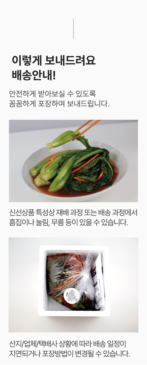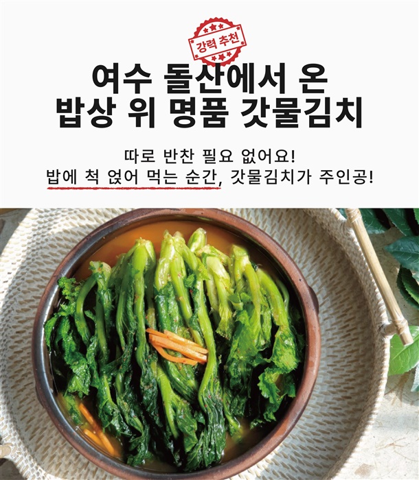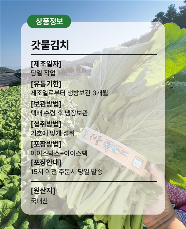 | 원재료명 및 함량 (원산지) | 절임갓(국내산)50%, 김치육수50%(고추가루(국내산), 풀죽, 배, 마늘, 양파, 생강, 다시마육수, 천일염(국내산), 당근, 설탕) |